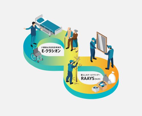 Lazcore チラシ グラフィック Client_株式会社Lazcore 介護業界と建設業を繋げるカスタマイズサービスのA4チラシを制作しました。 2つの事業のメリットを繋げるメインビジュアルを作り、コンセプトやサービス内容が視覚的にも分かりやすいようデザインしました。